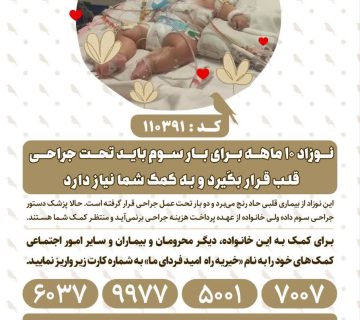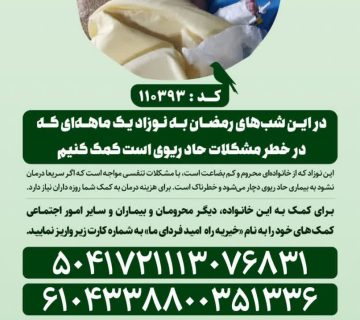 در این شبهای رمضان به نوزاد یک ماههای که در خطر مشکلات حاد ریوی است کمک کنیمAdminمارس 29, 2026این نوزاد که از خانوادهای محروم و کم بضاعت است، با مشکلات تنفسی مواجه است که اگر سریعا درمان نشود ... ادامه مطلب