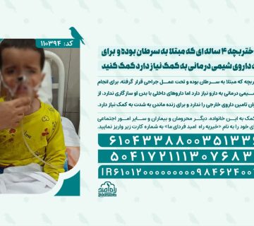 به دختربچه ۴ ساله ای که مبتلا به سرطان بوده و برای تهیه داروی شیمی درمانی به کمک نیاز دارد کمک کنیدAdminمارس 29, 2026این دختربچه که مبتلا به سرطان بوده و تحت عمل جراحی قرار گرفته، برای انجام مداوم شیمی درمانی به دارو ... ادامه مطلب