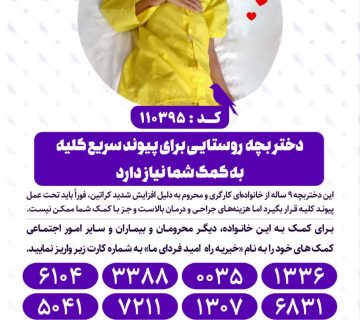 دختربچه روستایی برای پیوند سریع کلیه به کمک شما نیاز دارد Adminمارس 29, 2026این دختربچه ۹ ساله از خانوادهای کارگری و محروم به دلیل افزایش شدید کراتین، فوراً باید تحت عمل پیوند کلیه ... ادامه مطلب