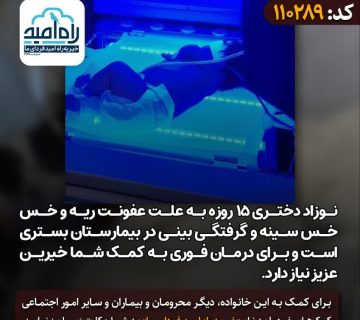 نوزاد دختری ۱۵ روزه به علت عفونت ریه و خس خس سینه و گرفتگی بینی در بیمارستان بستری است و برای درمان فوری به کمک شما خیرین عزیز نیاز داردAdminمارس 25, 2025برای کمک به این خانواده، دیگر محرومان و بیماران و سایر امور اجتماعی کمکهای خود را به نام «خیریه راه ... ادامه مطلب