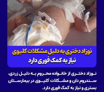 نوزاد دختری به دلیل مشکلات کلیوی نیاز به کمک فوری داردAdminآوریل 1, 2025نوزاد دختری از خانواده محروم به دلیل زردی، سندروم دان و مشکلات کلیوی در بیمارستان بستری و نیاز به کمک ... ادامه مطلب