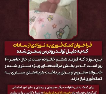 فراخوان کمک فوری به نوزادی از سادات که به دلیل تولد زودرس بستری شدهAdminآوریل 7, 2025این نوزاد که فرزند ششم خانواده است در حال حاضر ۴۰ روز است که در بخش مراقبتهای ویژه بستری شده ... ادامه مطلب