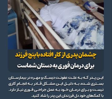 چشمان پدری از کار افتاده با پنج فرزند برای درمان فوری به دستان شماستAdminمارس 5, 2025این پدر که به علت عفونت دیسک و مهره در بیمارستان بستری شده، به دلیل این مشکل قادر به انجام ... ادامه مطلب