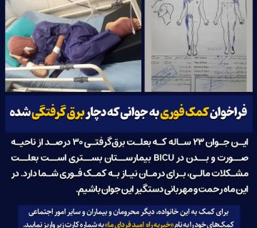 فراخوان کمک فوری به جوانی که دچار برق گرفتگی شدهAdminمارس 9, 2025این جوان ۲۳ ساله که بعلت برقگرفتیِ ۳۰ درصد از ناحیه صورت و بدن در Bicu بیمارستان بستری است، به ... ادامه مطلب