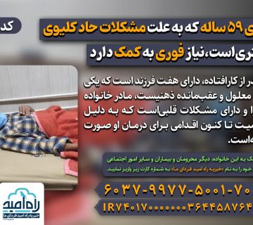 پدری ۵۹ ساله که به علت مشکلات حاد کلیوی بستریاست،نیاز فوری به کمک داردAdminمارس 11, 2025این پدر از کارافتاده،دارای هفت فرزند است که یکی از آنها معلول و عقبمانده ذهنیست، مادر خانواده ناشنوا و دارای ... ادامه مطلب
