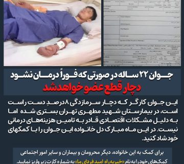 جوان ۲۲ ساله در صورتی که فوراً درمان نشود، دچار قطع عضو خواهدشدAdminمارس 18, 2025این جوان کارگر که دچار سرمازدگی ۸درصدِ دست راست است، در بیمارستان شهید مطهری تهران بستری شده اما به دلیل ... ادامه مطلب