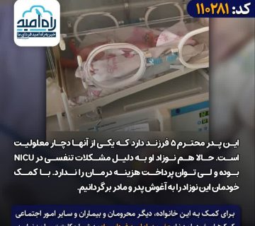 پدری دستفروش برای ترخیص نوزادش نیاز فوری به کمک شما داردAdminفوریه 3, 2025این پدر محترم ۵ فرزند دارد که یکی از آنها دچار معلولیت است. حالا هم نوزاد او به دلیل مشکلات ... ادامه مطلب
