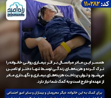 مادر نابینا و مبتلا به دیابت برای درمان به کمک فوری شما نیاز داردAdminفوریه 9, 2025همسر این مادر میانسال بر اثر بیماری روانی خانواده را ترک کرده و هزینههای زندگی توسط تنها دختر او تامین ... ادامه مطلب