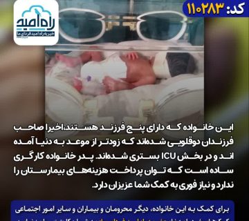 نوزادان دوقلو از خانوادهای پرجمعیت و محروم،به دلیل تولد زودرس و درمان به کمک فوری نیاز دارندAdminفوریه 20, 2025این خانواده که دارای پنج فرزند هستند،اخیرا صاحب فرزندان دوقلویی شدهاند که زودتر از موعد به دنیا آمدهاند و در ... ادامه مطلب