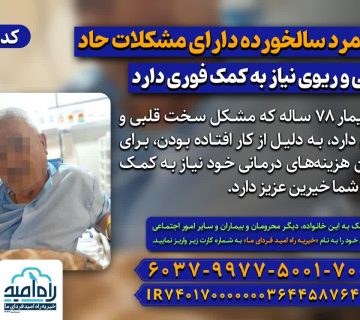 پیرمرد سالخورده دارای مشکلات حاد قلبی و ریوی نیاز به کمک فوری داردAdminفوریه 24, 2025ین بیمار ٧٨ ساله كه مشكل سخت قلبي و ریوی دارد، به دلیل از کار افتاده بودن، برای تامین هزینههای ... ادامه مطلب