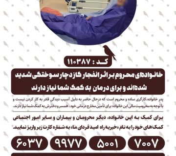 خانوادهای محروم بر اثر انفجار گاز دچار سوختگی شدید شدهاند و برای درمان به کمک شما نیاز دارندAdminمارس 8, 2026پدر خانواده،کارگری ساده و محروم است که درحال حاضر به دلیل آسیب دیدگی قادر به کار کردن نیست وبا توجه ... ادامه مطلب