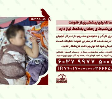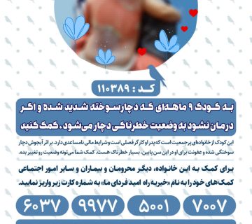 به کودک ۹ ماههای که دچارسوخته شدید شده و اگر درمان نشود به وضعیت خطرناکی دچار میشود ، کمک کنیدAdminمارس 8, 2026این کودک از خانوادهای پرجمعیت است که پدر او کارگر فصلی است و شرایط مالی نامساعدی دارد. بر اثر آبجوش ... ادامه مطلب