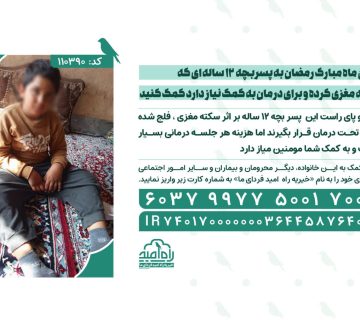 در این ماه مبارک رمضان به پسربچه ۱۲ ساله ای که سکته مغزی کرده و برای درمان به کمک نیاز دارد کمک کنیدAdminمارس 8, 2026دست و پای راست این پسر بچه 12 ساله بر اثر سکته مغزی ، فلج شده و باید تحت درمان ... ادامه مطلب