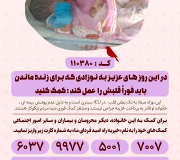 در این روز های عزیز به نوزادی که برای زنده ماندن باید فوراً قلبش را عمل کند ؛ کمک کنیدAdminفوریه 9, 2026این نوزاد مبتلا به تک بطنی قلب ، در icu بستری است و به دلیل عدم پوشش بیمه ای ، ... ادامه مطلب