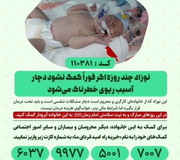 نوزاد چند روزه اگر فوراً کمک نشود دچار آسیب ریوی خطرناک میشودAdminفوریه 9, 2026این نوزاد که از خانوادهای کارگری و محروم است دوار مشکلات تنفسی است و باید تحت درمان قرار بگیرد اما ... ادامه مطلب