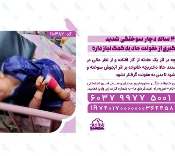 دختربچه ۴ ساله دچار سوختگی شدید و برای جلوگیری از عفونت حاد به کمک نیاز دارهAdminفوریه 9, 2026پدر این دختربچه بر اثر یک حادثه از کار افتاده و از نظر مالی در شرایط بدی هستند حالا دختربچه ... ادامه مطلب