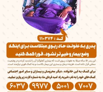به مادر ۴۰ سالهای که به سرطان روده مبتلا شده و به کمک فوری برای درمان نیاز دارد کمک کنیدAdminفوریه 9, 2026این مادر که ۳ فرزند دارد و خود سرپرست خانوار است، متأسفانه به سرطان روده مبتلاست و توان تامین هزینههای ... ادامه مطلب