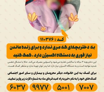 به دختربچهای که مری ندارد و برای زنده ماندن نیاز فوری به دستگاه اکسیژن دارد ، کمک کنیدAdminفوریه 9, 2026این دختربچه ۳ ساله با سرنگ تغذیه میشود و انسولین مصرف میکند. حالا با مشکل تنفسی شدید مواجه است و ... ادامه مطلب