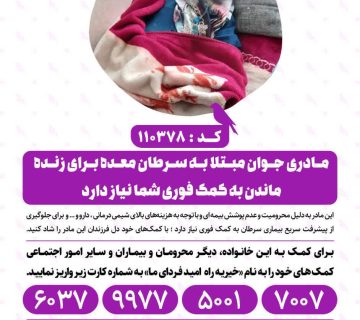 مادری جوان مبتلا به سرطان معده برای زنده ماندن به کمک فوری شما نیاز داردAdminفوریه 9, 2026این مادر به دلیل محرومیت و عدم پوشش بیمهای و با توجه به هزینههای بالای شیمیدرمانی،دارو و.. و برای جلوگیری ... ادامه مطلب