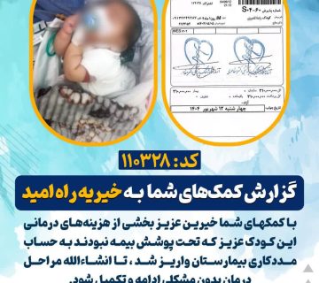 گزارش کمک های شما به خیریه راه امید :کد : (110328 )Adminسپتامبر 18, 2025با کمکهای شما خیرین عزیز بخشی از هزینههای درمانی این کودک عزیز که تحت پوشش بیمه نبودند به حساب مددکاری ... ادامه مطلب