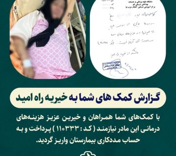 گزارش کمک های شما به خیریه راه امید کــد : 110333Adminاکتبر 3, 2025با کمکهای شما همــراهان و خیریــن عزیــز هزینــههای درمانــی این مادر نیازمنــد پــرداخت و بــه حساب مـددکاری بیمارستان واریــز گردید. ... ادامه مطلب