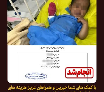 گزارش کمک های شما به خیریه راه امید : (کد 110308)Adminسپتامبر 9, 2025با كمک های شما خیریـن و همراهان عزیـز هزینـه های درمان این کودک 2 ساله پرداخت و از بیمارستان ترخیص ... ادامه مطلب