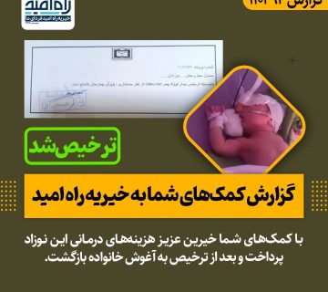 گزارش کمک های شما به خیریه راه امید : (کد ۱۱۰۲۹۱)Adminسپتامبر 4, 2025با کمک های شما عزیزان هزینههای زایمان و جراحی داخلی این مادر پرداخت شد و به لطف خدا از بیمارستان ... ادامه مطلب