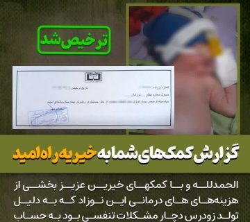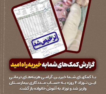 گزارش کمکهای شما به خیریه راه امید (کد ۱۱۰۳۱۹)Adminجولای 29, 2025با کمکهای شما خیرین گرامی هزینههای درمانی این نوزاد ۴ روزه به حساب مددکاری بیمارستان واریز شد و نوزاد به ... ادامه مطلب