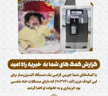 گزارش کمک های شما به خیریه راه امید کد : (110376)Adminفوریه 13, 2026با کمکهای شما خیرین گرامی یک دستگاه اکسیژنساز برای این کودک عزیز که دارای مشکلات حاد تنفسی بود خریداری و ... ادامه مطلب