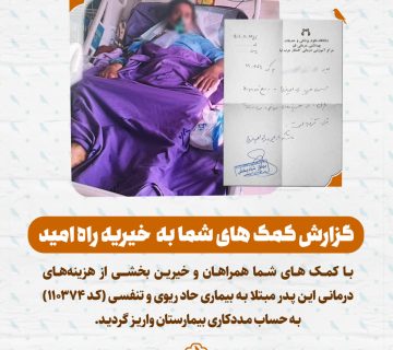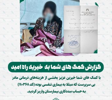 گزارش کمک های شما به خیریه راه امید کد : (110368)Adminفوریه 9, 2026با کمک های شما خیرین عزیـز بخشی از هزینههای درمانی مادر بی سرپرست که مبتلا به بیماری تنفسی بوده بـه ... ادامه مطلب