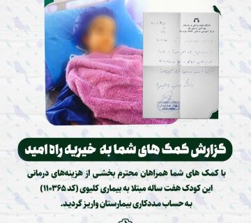 گزارش کمک های شما به خیریه راه امید:(کد : 110365)Adminمارس 8, 2026با کمک های شما همراهان محترم بخشــی از هزینههای درمانی این کودک هفت ساله مبتلا به بیماری کلیوی بـه حساب ... ادامه مطلب