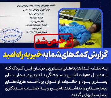 گزارش کمکهای شما به خیریه راه امید فردا:Adminفوریه 28, 2025به لطف خدا هزینههای بستری و درمان این کودک که به دلیل عفونت ناشی از سوختگی با بنزین در بیمارستان ... ادامه مطلب