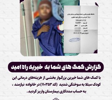گزارش کمک های شما به خیریه راه امید:(کد : 110353)Adminدسامبر 25, 2025با کمک های شما خیرین بزرگــوار بخشــی از هزینههای درمانی این کودک مبتلا به سوختگی شدیـد در خانواده نیازمنـد ، ... ادامه مطلب