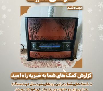 گزارش کمک های شما به خیریه راه امیدAdminفوریه 9, 2026با کمکهای شما و در این روزهای سرد سال دو دستگاه بخــاری برای دو خانوادهی نیازمند ، تهیه و تقدیم ... ادامه مطلب