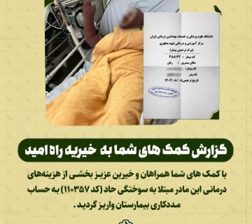 گزارش کمک های شما به خیریه راه امید کد :( 110357)Adminفوریه 9, 2026با کمک های شما همراهان و خيرين عزیــز بخشــی از هزینههای درمانـی این مادر مبتلا به سوختگی حاد بـه حساب ... ادامه مطلب