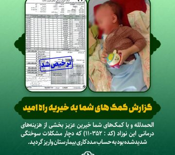 گزارش کمک های شما به خیریه راه امید:(کد : 110352)Adminنوامبر 11, 2025الحمدلله و با کمکهای شما خیرین عزیـز بخشی از هزینههای درمانـی این نوزاد که دچار مشکلات سوختگی شدیدشـده بود به ... ادامه مطلب