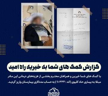گزارش کمک های شما به خیریه راه امید:(کد : 110334)Adminنوامبر 11, 2025با کمک های شما خیرین و همراهان محتــرم بخشــی از هزینههای درمانی این مادر مبتلا به بیماری حاد کلیوی به ... ادامه مطلب