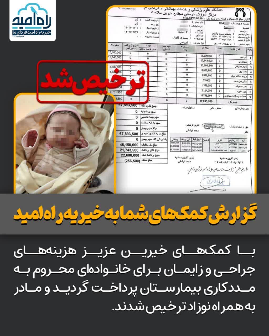 با کمکهای خیرین عزیز هزینههای جراحی و زایمان برای خانوادهای محروم به مددکاری بیمارستان پرداخت گردید و مادر به همراه نوزاد ترخیص شدند