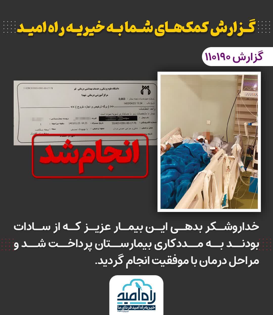 خداروشکر بدهی این بیمار عزیز که از سادات بودند به، مددکاری بیمارستان پرداخت شد و مراحل درمان با موفقیت انجام گردید.