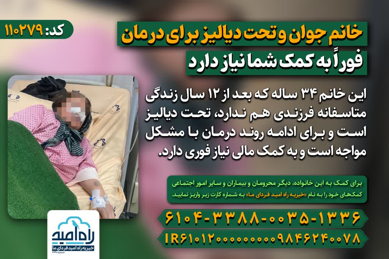 این خانم ۳۴ ساله که بعد از ۱۲ سال زندگی متاسفانه فرزندی هم ندارد، تحت دیالیز است و برای ادامه روند درمان با مشکل مواجه است و به کمک مالی نیاز فوری دارد.