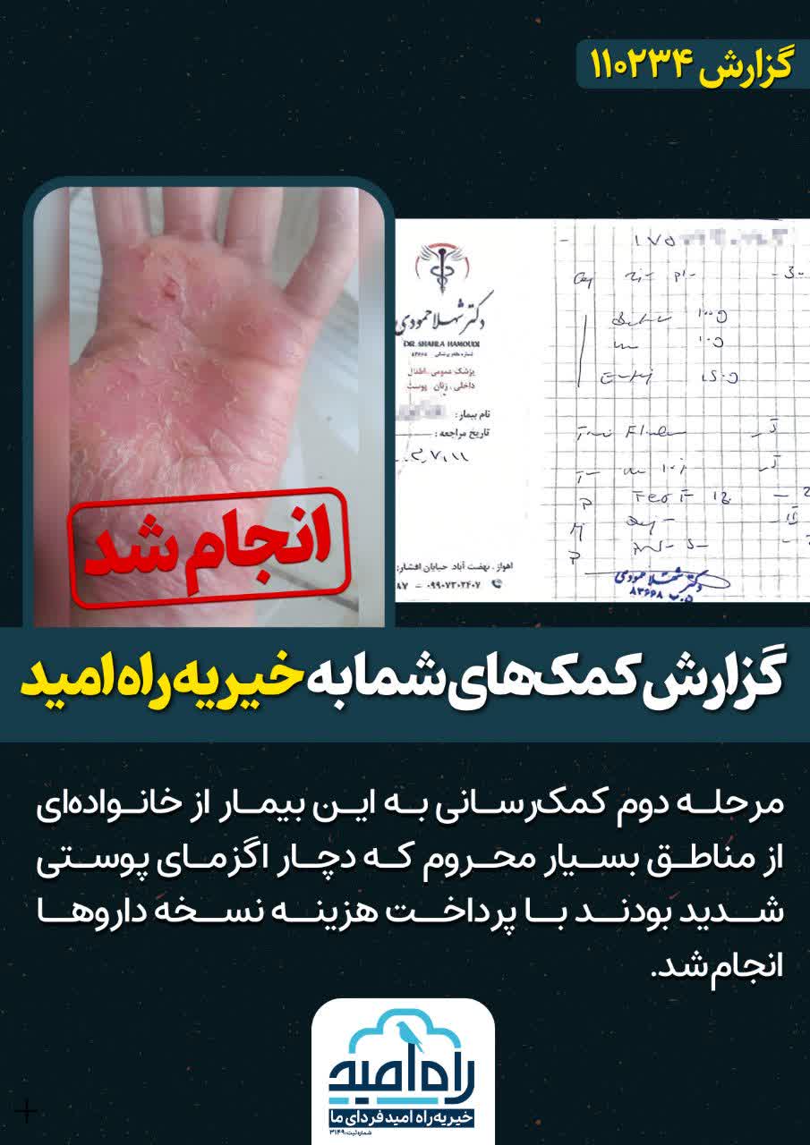 مرحله دوم کمکرسانی به این بیمار از خانوادهای از مناطق بسیار محروم که دچار اگزمای پوستی شدید بودند با پرداخت هزینه نسخه داروها انجام شد.