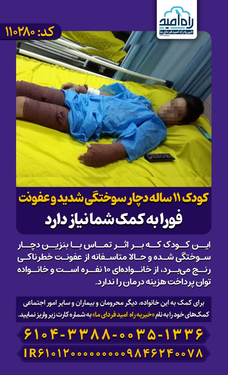 کودک یازده ساله دچار سوختگی شدید و عفونت فورا به کمک شما نیاز دارد