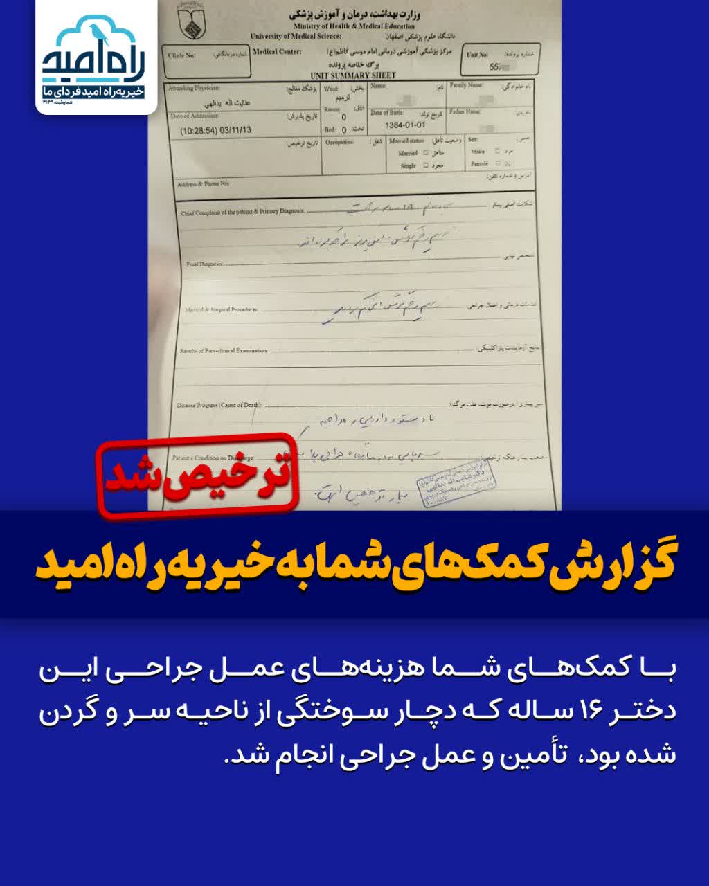 ا کمکهای شما هزینههای عمل جراحی این دختر ۱۶ ساله که دچار سوختگی از ناحیه سر و گردن شد تأمین و عمل جراحی انجام شد
