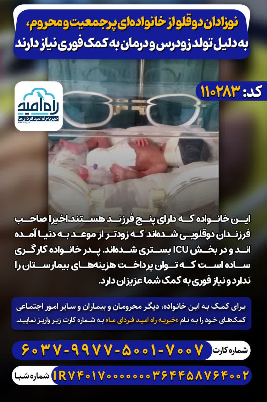 این خانواده که دارای پنج فرزند هستند،اخیرا صاحب فرزندان دوقلویی شدهاند که زودتر از موعد به دنیا آمدهاند و در بخش icu بستری شدهاند.