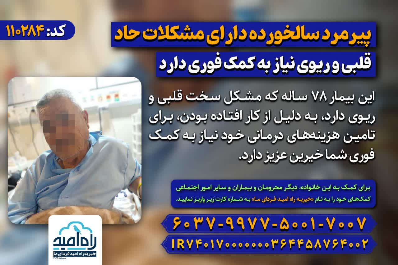 ین بیمار ٧٨ ساله كه مشكل سخت قلبي و ریوی دارد، به دلیل از کار افتاده بودن، برای تامین هزینههای درمانی خود نیاز به کمک فوری شما خیرین عزیز دارد.