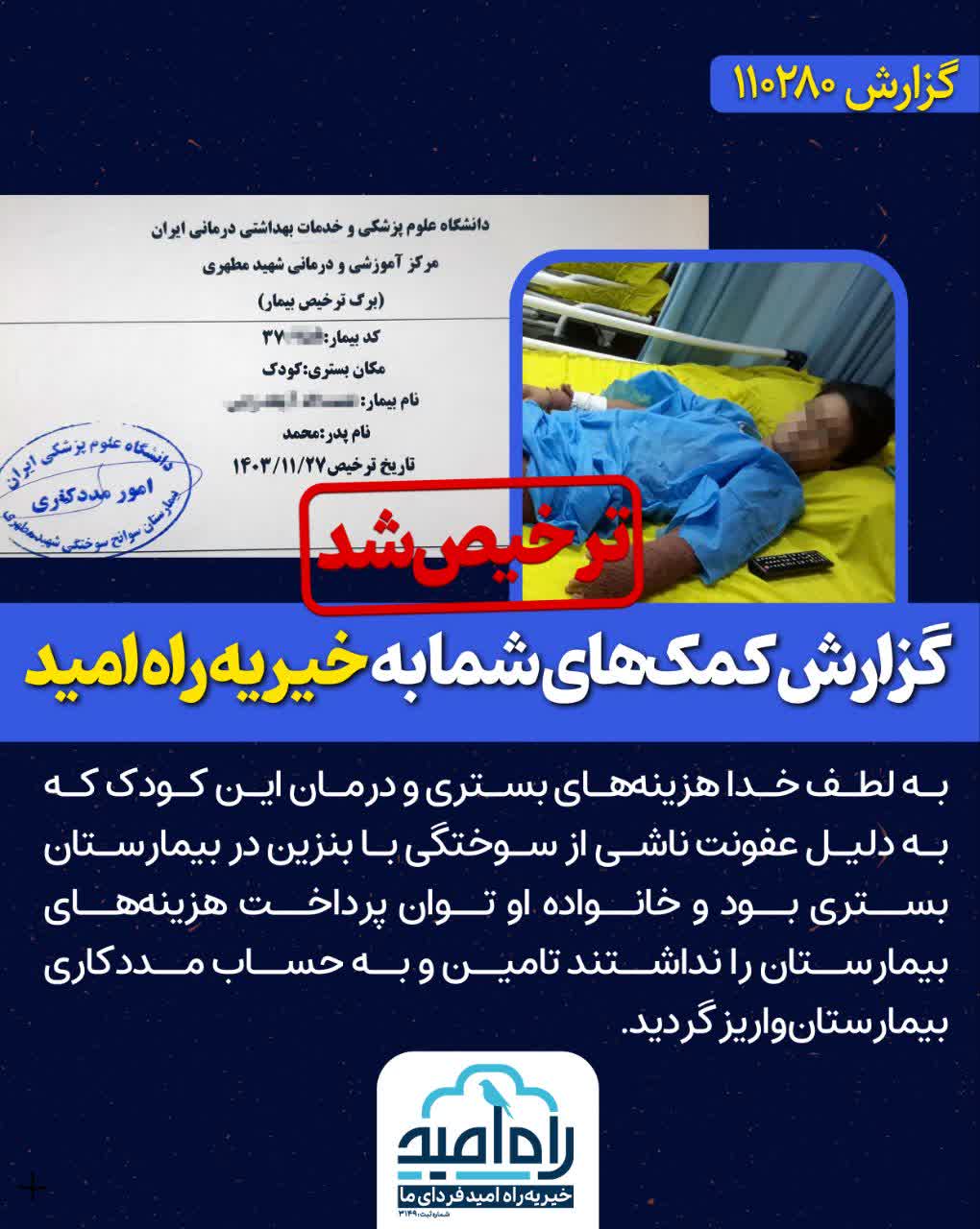 به لطف خدا هزینه‌‌های بستری و درمان این کودک که به دلیل عفونت ناشی از سوختگی با بنزین در بیمارستان بستری بود و خانواده او توان پرداخت هزینه‌های بیمارستان را نداشتند تامین و بحساب مددکاری بیمارستان واریز گردید.