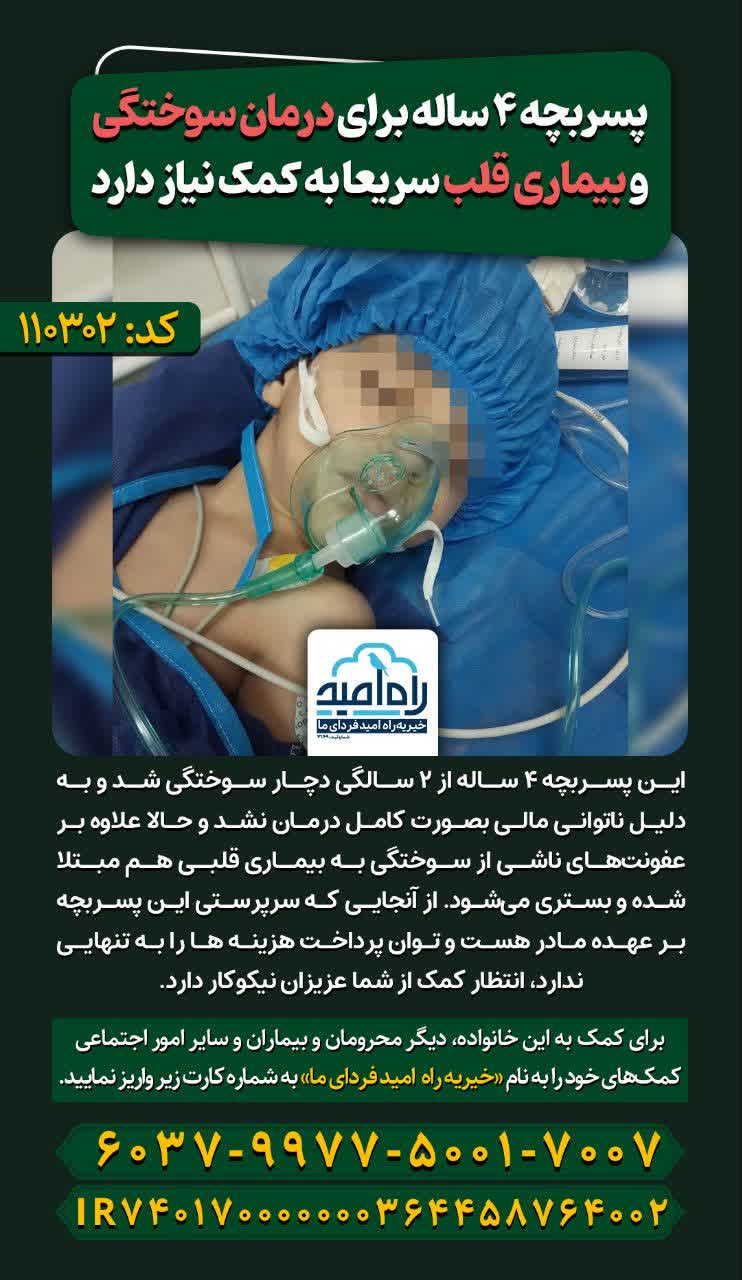 این پسربچه ۴ ساله از ۲ سالگی دچار سوختگی شد و به دلیل ناتوانی مالی بصورت کامل درمان نشد و حالا علاوه بر عفونتهای ناشی از سوختگی به بیماری قلبی هم مبتلا شده و بستری میشود. از آنجایی که سرپرستی این پسربچه بر عهده مادر هست و توان پرداخت هزینه ها را به تنهایی ندارد، انتظار کمک از شما عزیزان نیکوکار دارد.