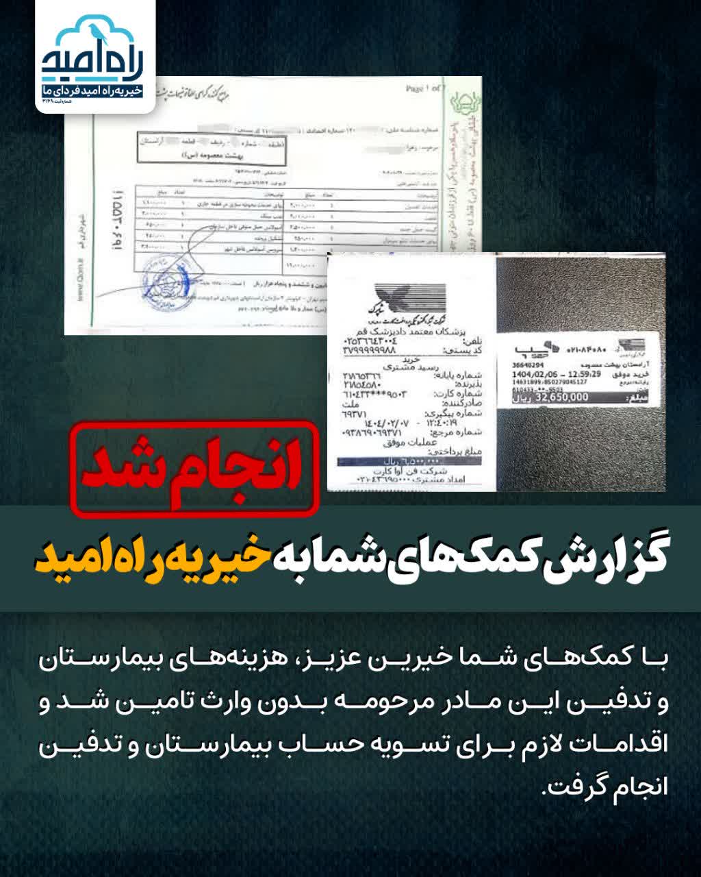 با کمکهای شما خیرین عزیز، هزینههای بیمارستان و تدفین این مادر مرحومه بدون وارث تامین شد و اقدامات لازم برای تسویه حساب بیمارستان و تدفین انجام گرفت.