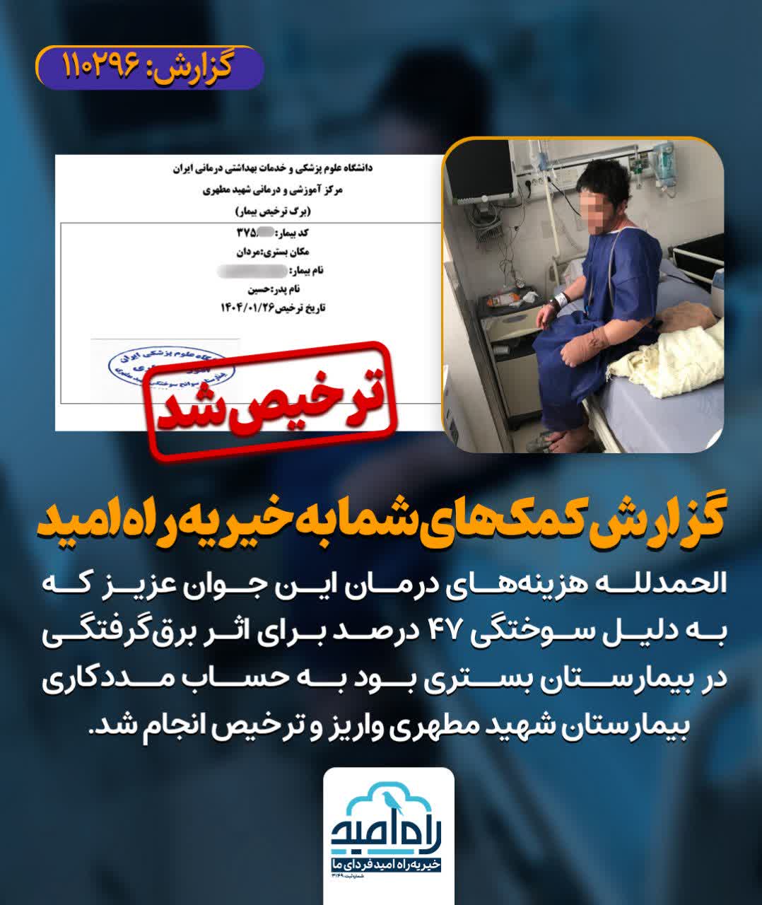 الحمدلله هزینههای درمان این جوان عزیز که به دلیل سوختگی ۴۷ درصد برای اثر برقگرفتگی در بیمارستان بستری بود به حساب مددکاری بیمارستان شهید مطهری واریز و ترخیص انجام شد.