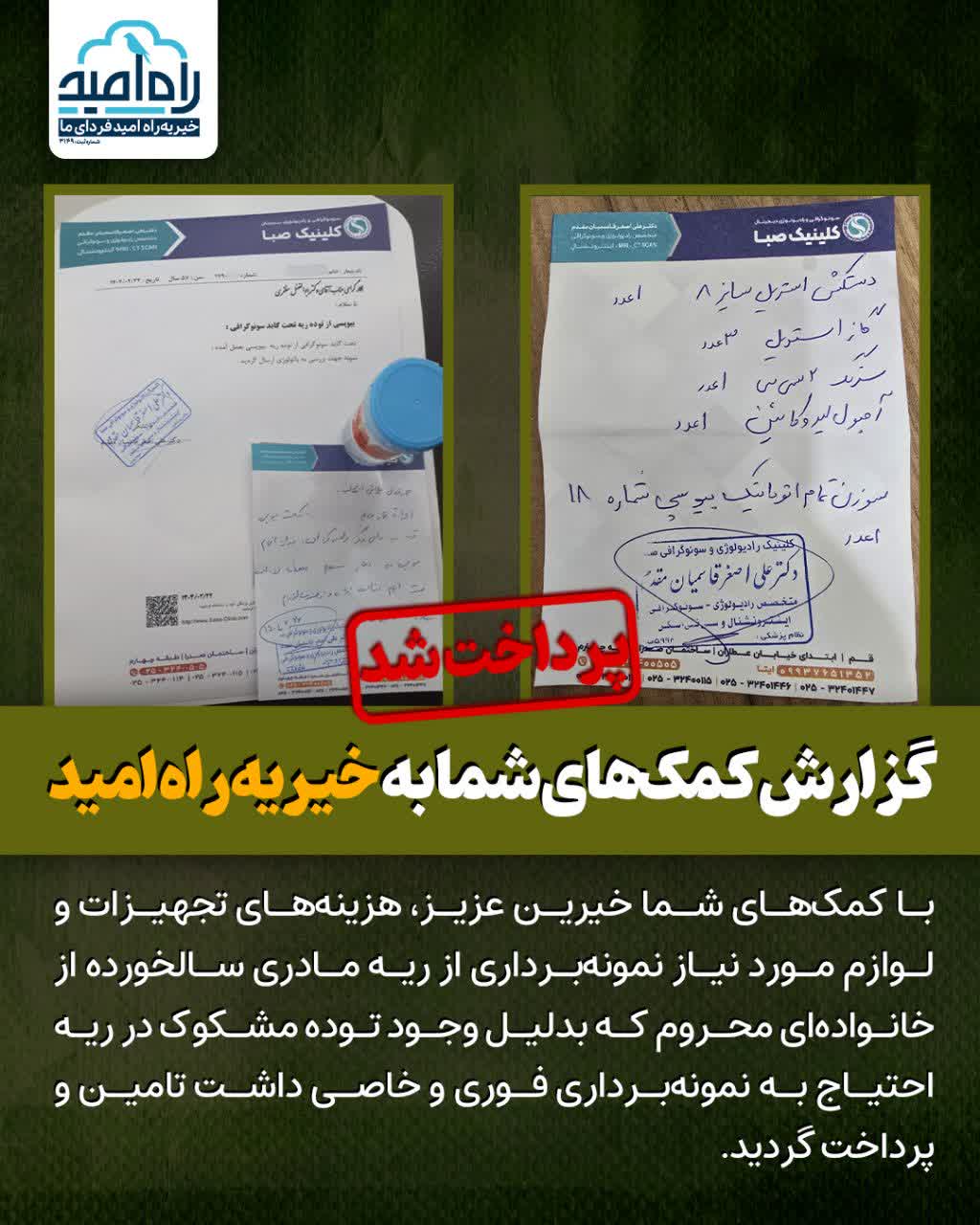 با کمکهای شما خیرین عزیز، هزینههای تجهیزات و لوازم مورد نیاز نمونهبرداری از ریه مادری سالخورده از خانوادهای محروم که بدلیل وجود توده مشکوک در ریه احتیاج به نمونهبرداری فوری و خاصی داشت تامین و پرداخت گردید.
